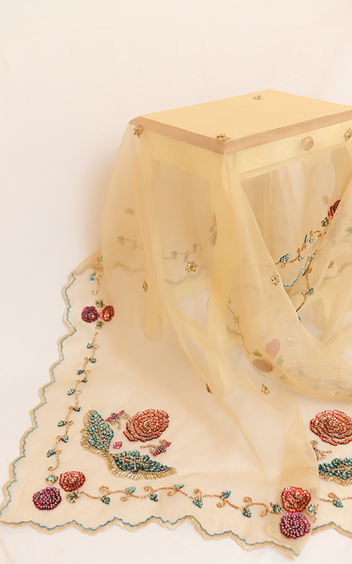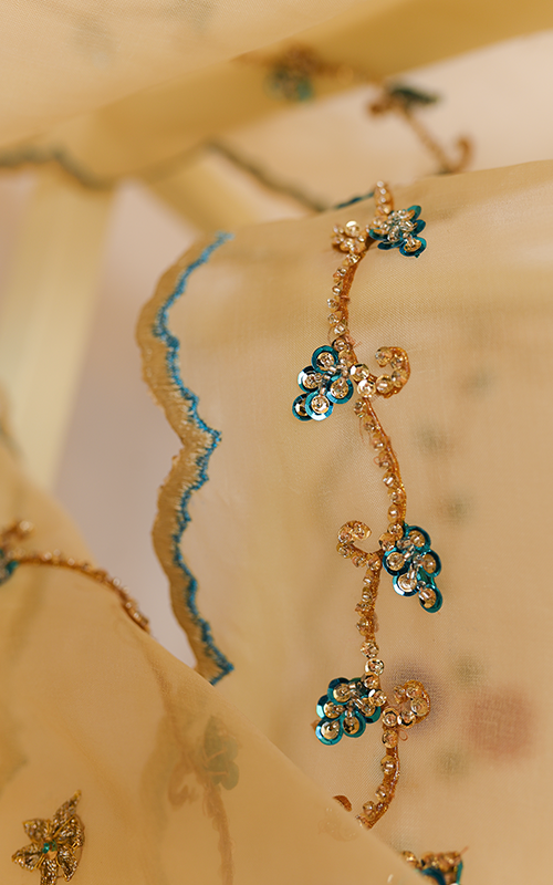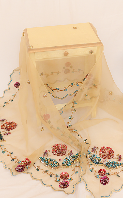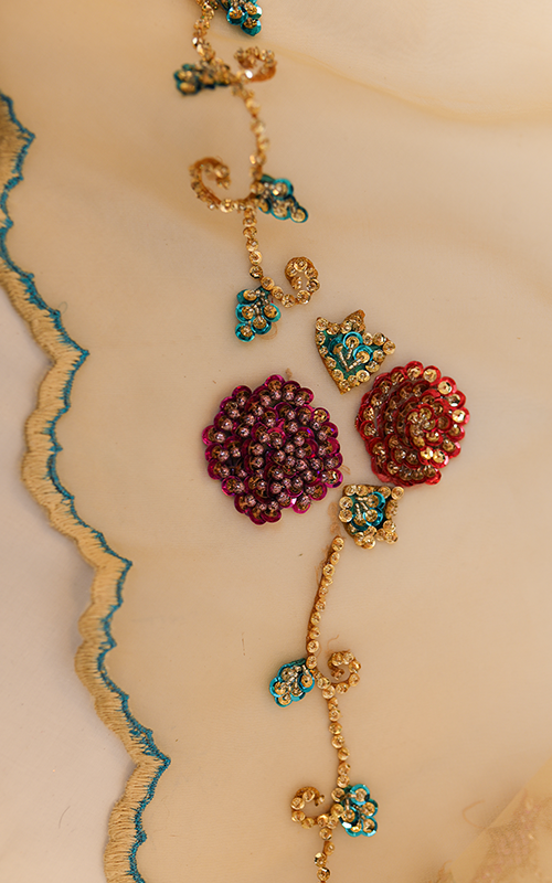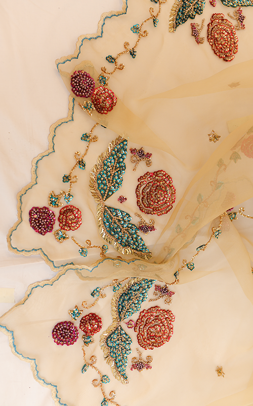 Baagh-e-Noor – A radiant organza dupatta that blooms with vibrant handwork across every inch — from bold floral bunches and leafy vines to delicately scalloped, beaded edges. Each thread is a tribute to artisanal finesse, turning this piece into a glowing garden of elegance.