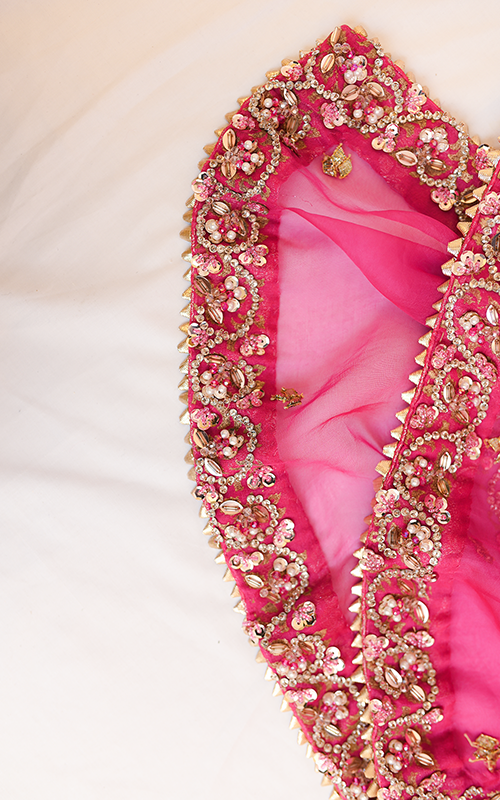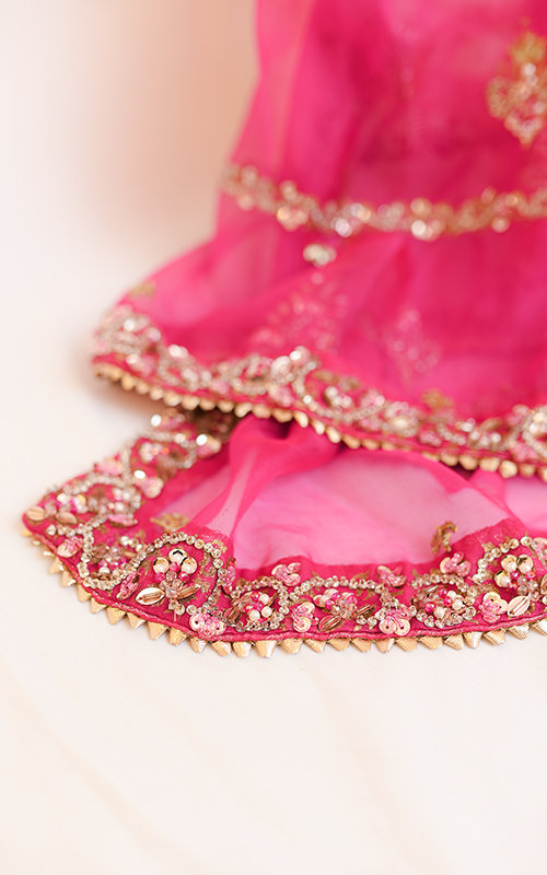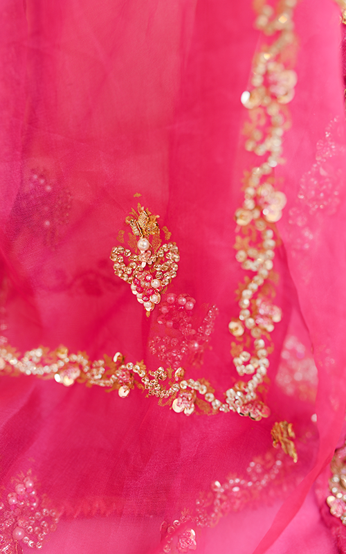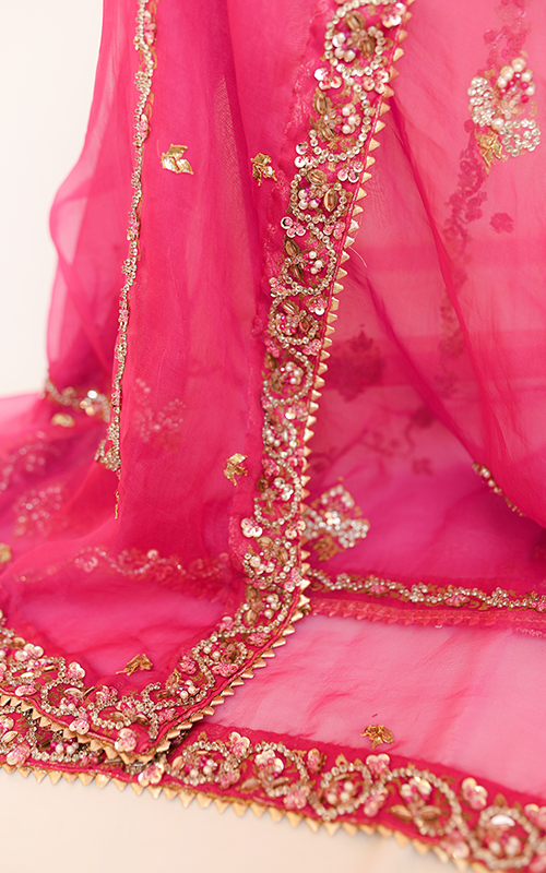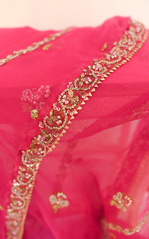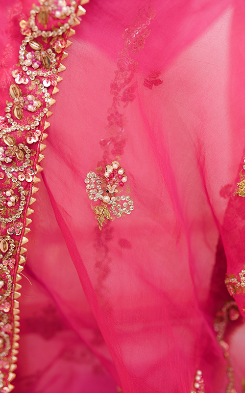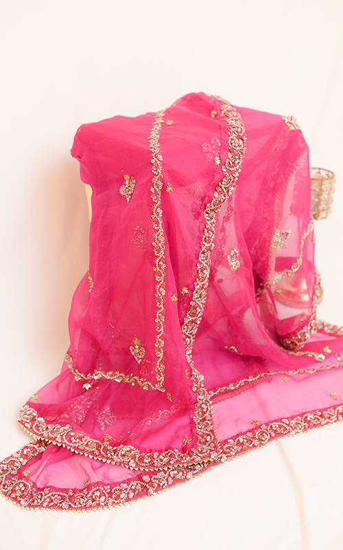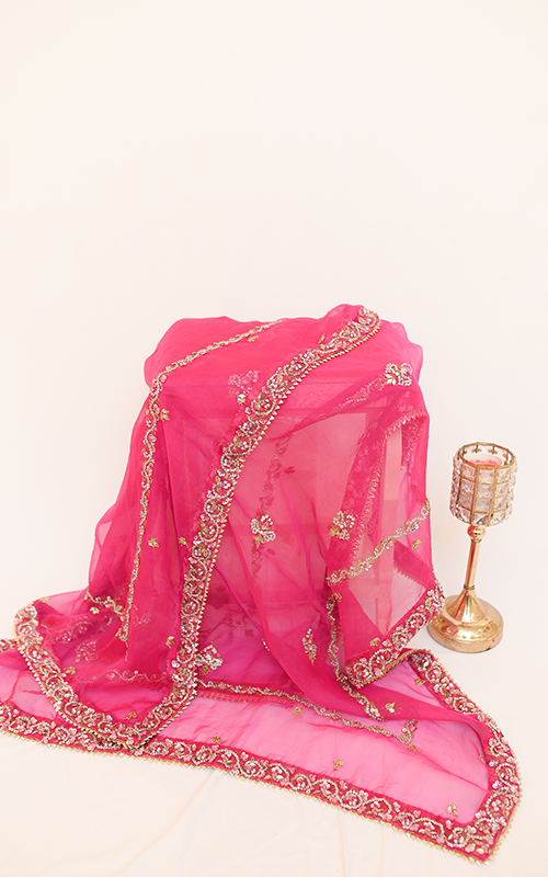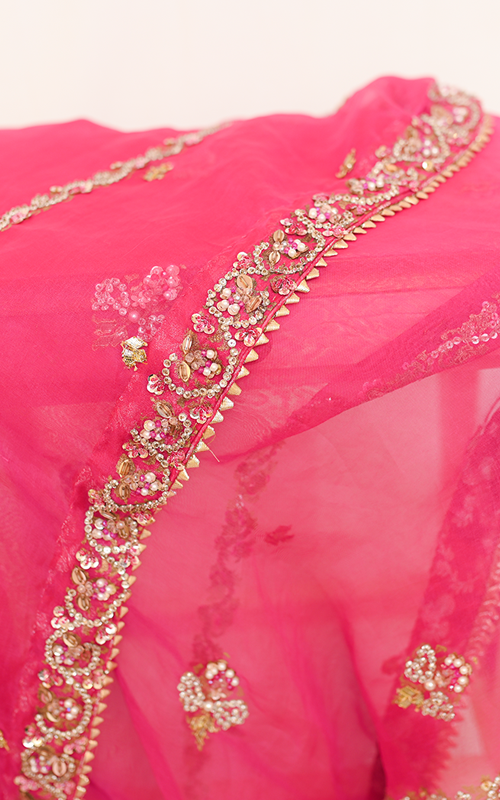 RANGREZ – A stunning organza dupatta that radiates the bold beauty of a blooming rose, featuring intricate handwork on every inch — from heavily embellished borders to scattered floral motifs. Its vibrant pink hue and shimmering craftsmanship make it a showstopper for any festive look.