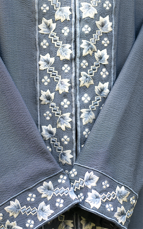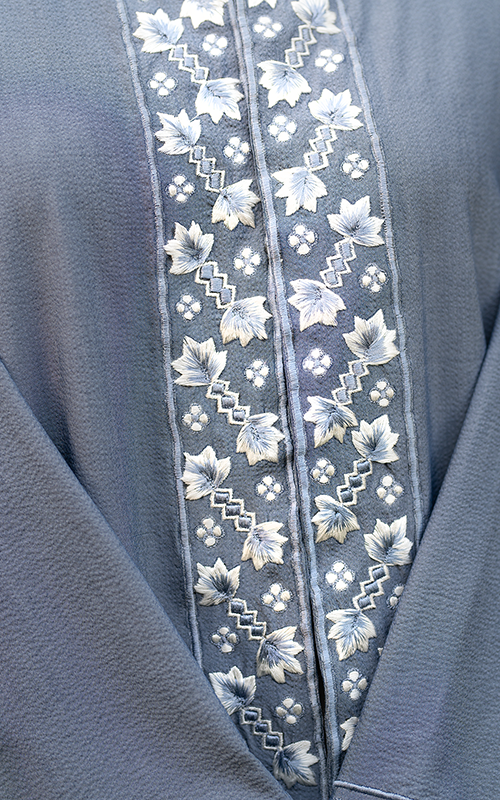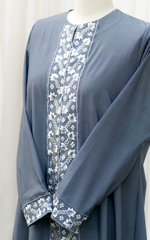 Sahar – A gentle ode to dawn, this silk abaya embraces you in serene blue hues and delicate floral embroidery and handwork on sleeves. Graceful, breathable, and timeless — it’s elegance woven into every thread.