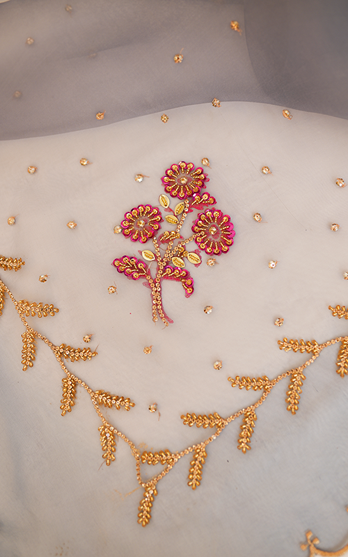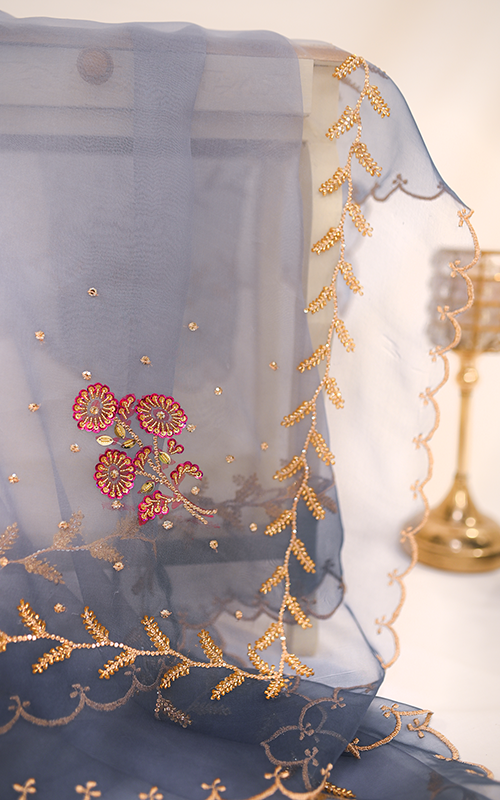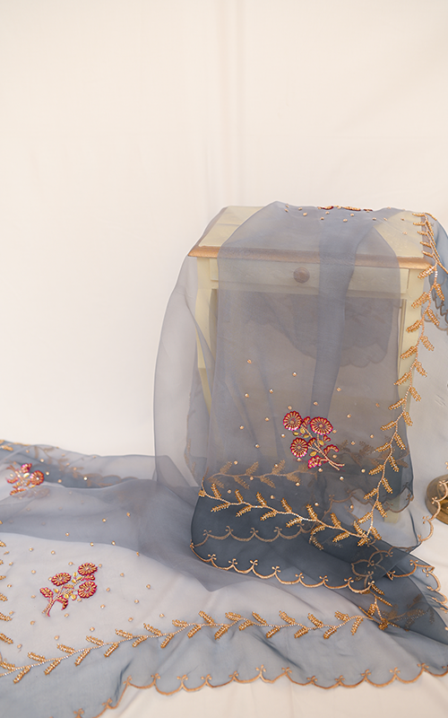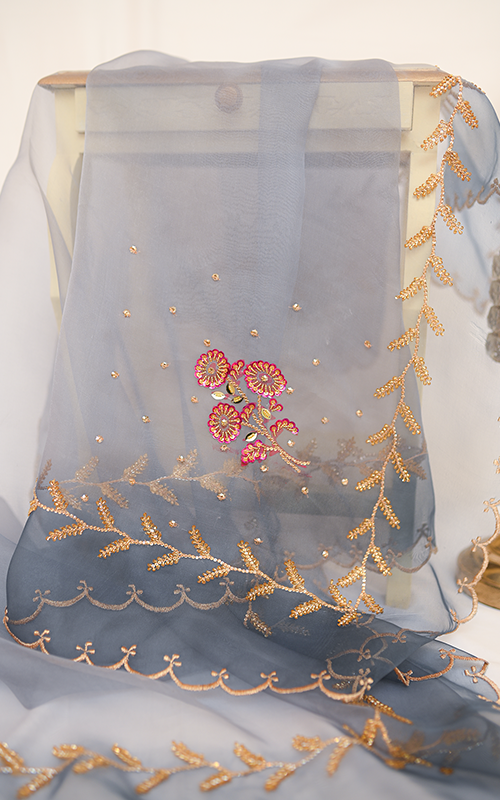 Sunehri – A breathtaking organza dupatta that captures the charm of a golden breeze, with intricate handwork gracing every inch—from scalloped borders and floral bunches to delicate vines and scattered sequins. Light, airy, and artfully embellished, it’s a timeless piece of elegance and craftsmanship.