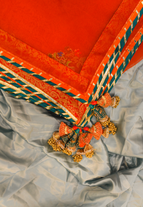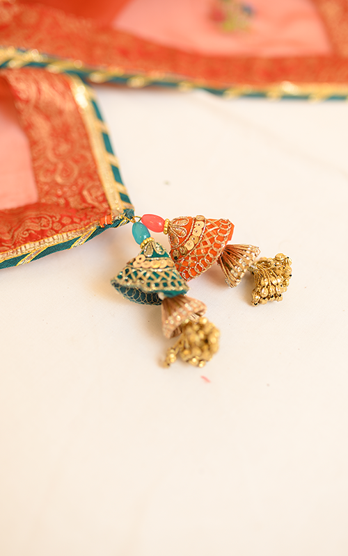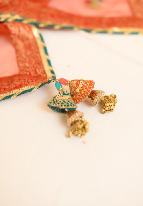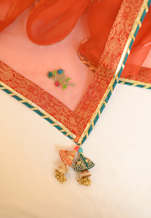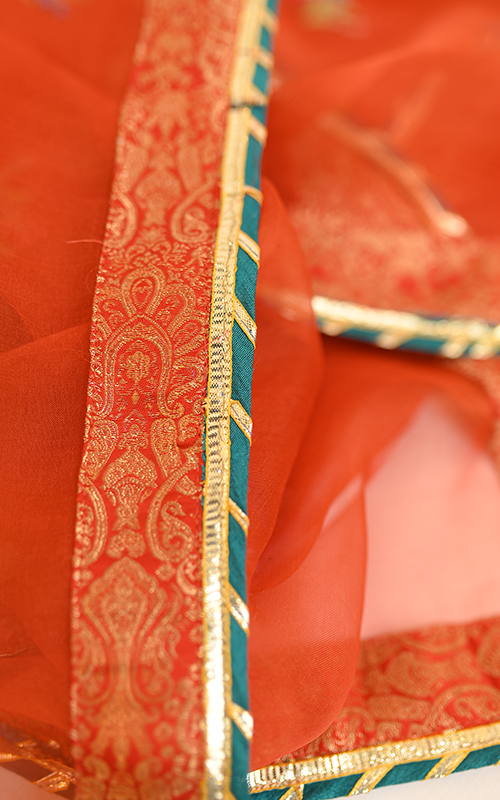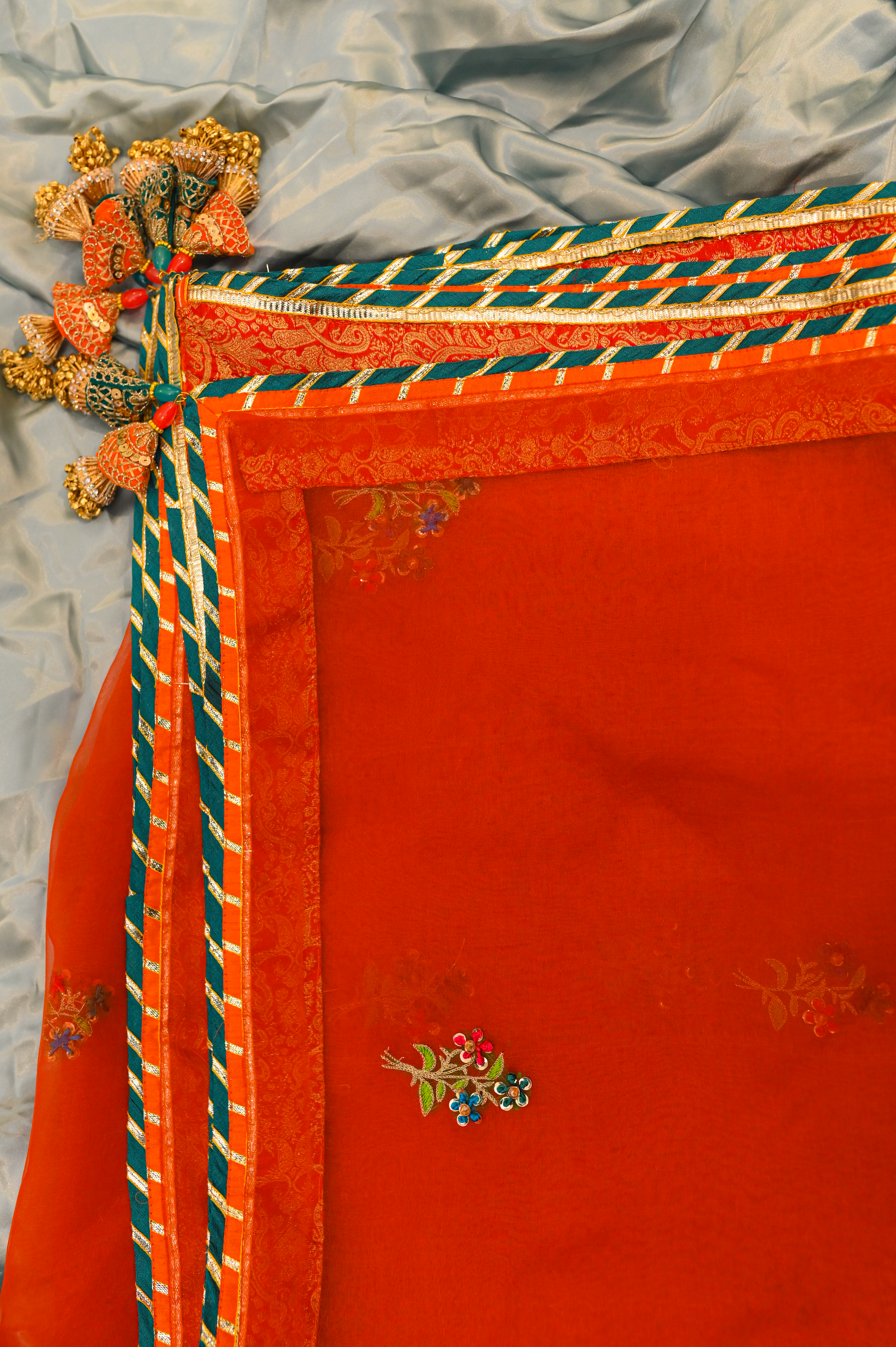 Tehzeeb – A vibrant organza dupatta that beautifully reflects cultural elegance, featuring intricate handwork from corner to corner — with colorful floral motifs, rich golden borders, and handcrafted tassels. Every detail is a tribute to timeless tradition, adding festive charm to any ensemble.