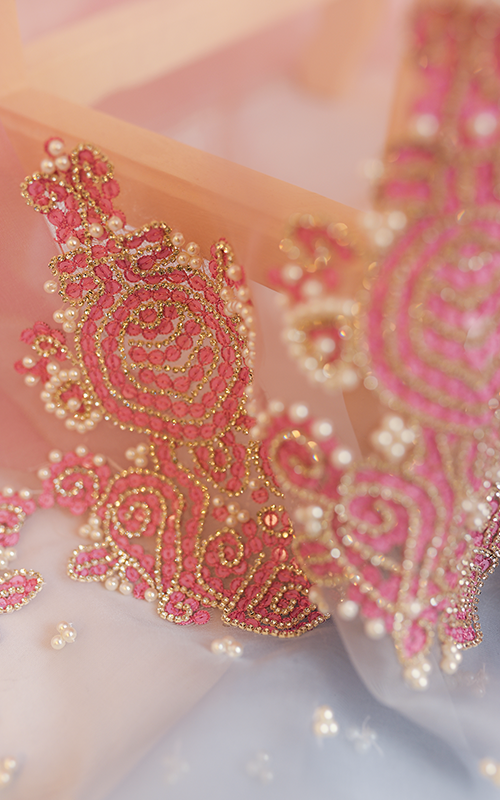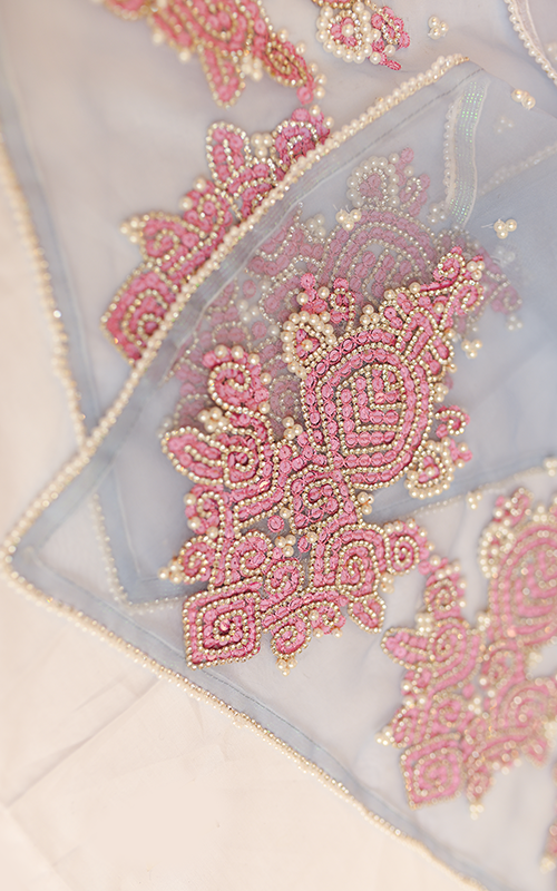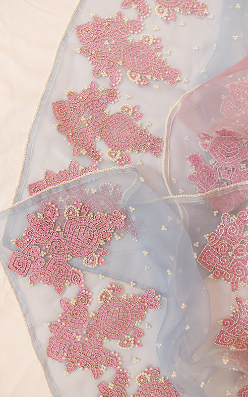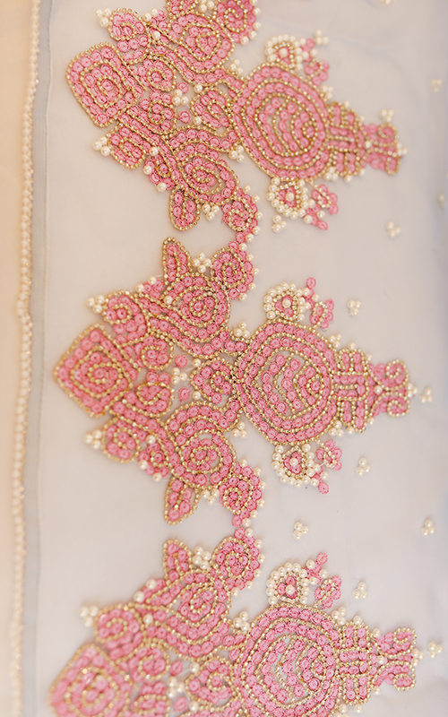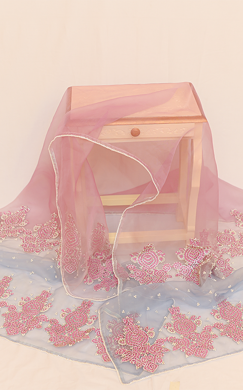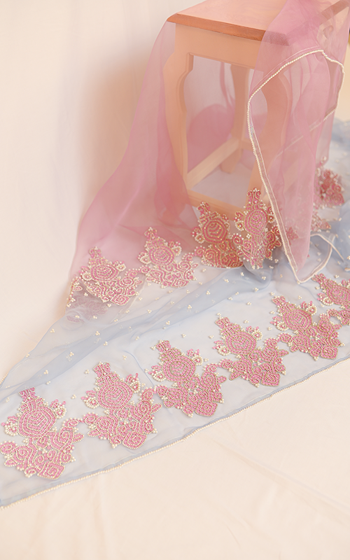 Zarnigar – A dreamy organza dupatta, fully adorned with exquisite handwork featuring golden vines, floral bunches, and scattered sequin accents. Every detail, from the central blooms to the delicate borders, is crafted by hand to reflect timeless elegance and artisanal finesse.