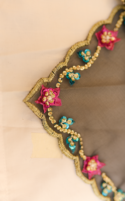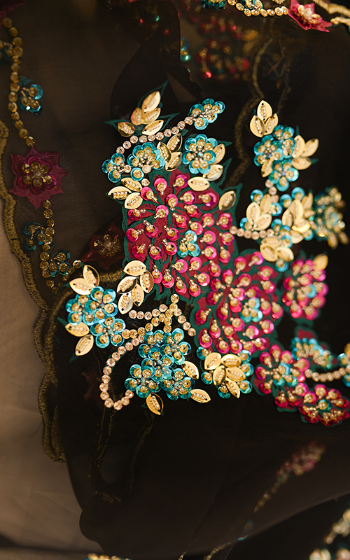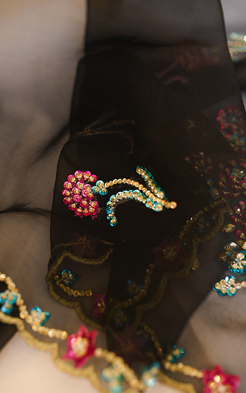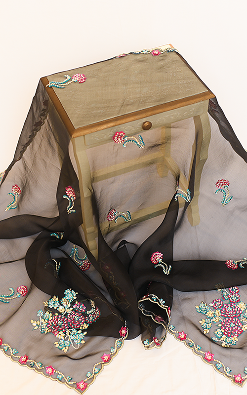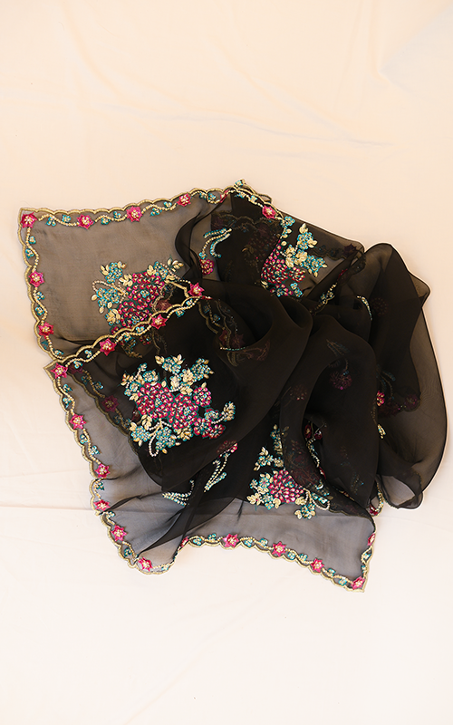 Zehra Noir – A captivating black organza dupatta that blends bold elegance with delicate charm, adorned with vibrant handwork across every inch—from rich floral bunches to scalloped, beaded edges. Every motif is meticulously handcrafted, making Zehra Noir a timeless statement of grace and artistry.